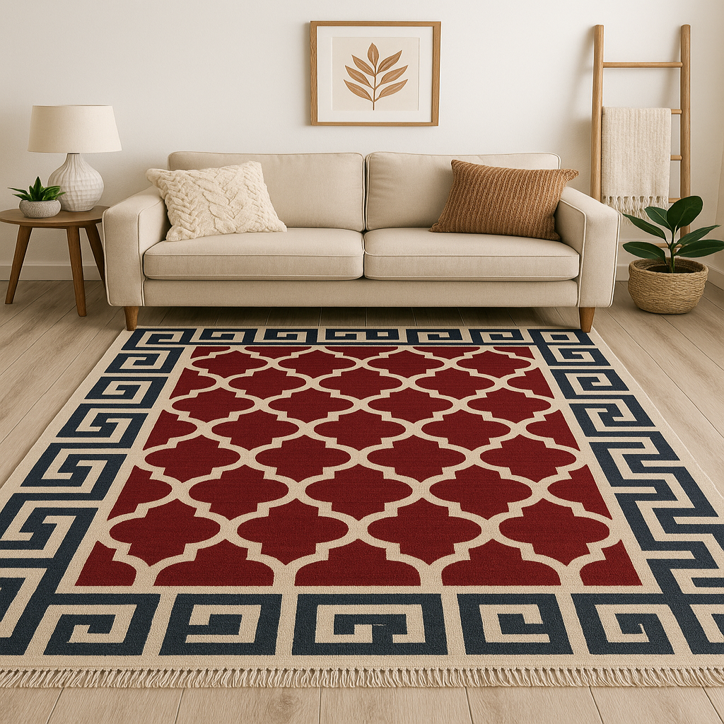 Traditional geometric area rug with bold red tones, perfect for living rooms, classic interiors, and statement home décor.