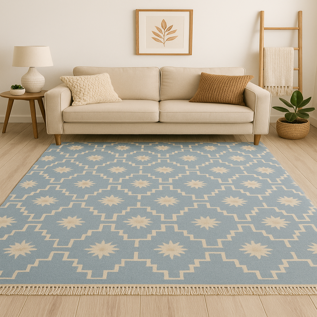 Soft blue geometric rug with elegant design, ideal for modern living rooms, bedrooms, and stylish home décor.