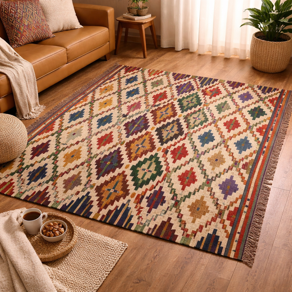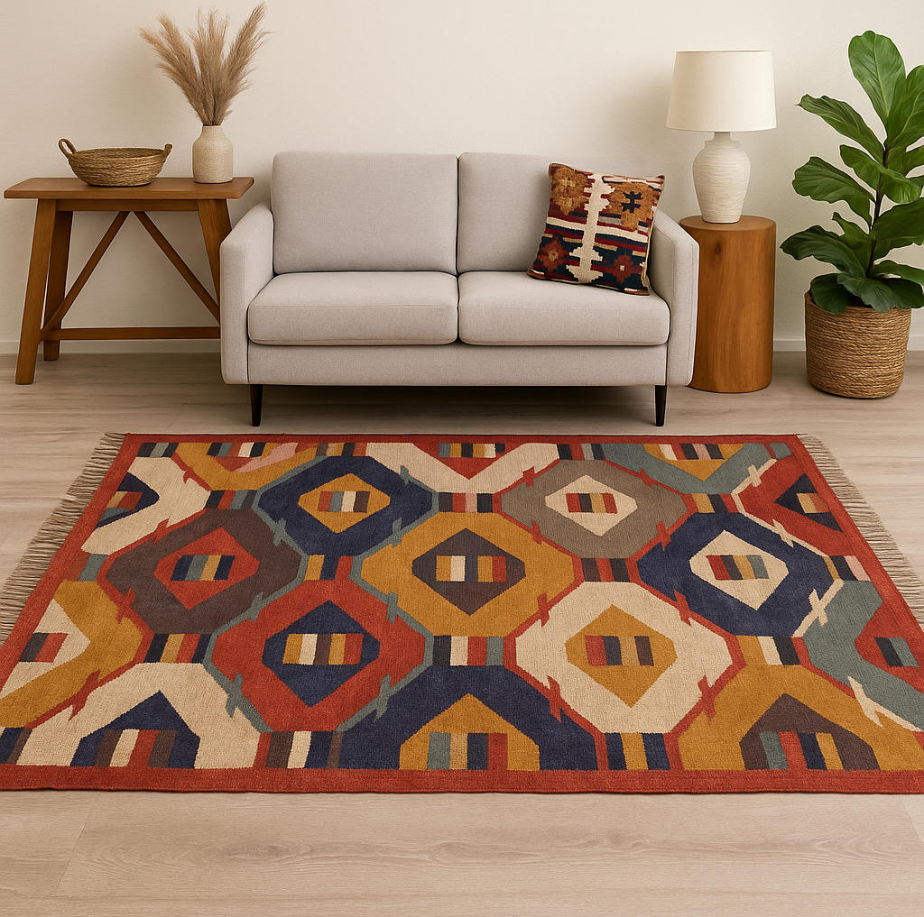 Multicolor geometric rug for boho and modern interiors, perfect for living rooms, vibrant spaces, and artistic home décor.
