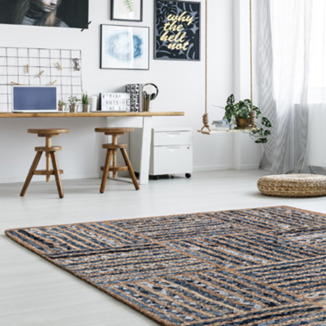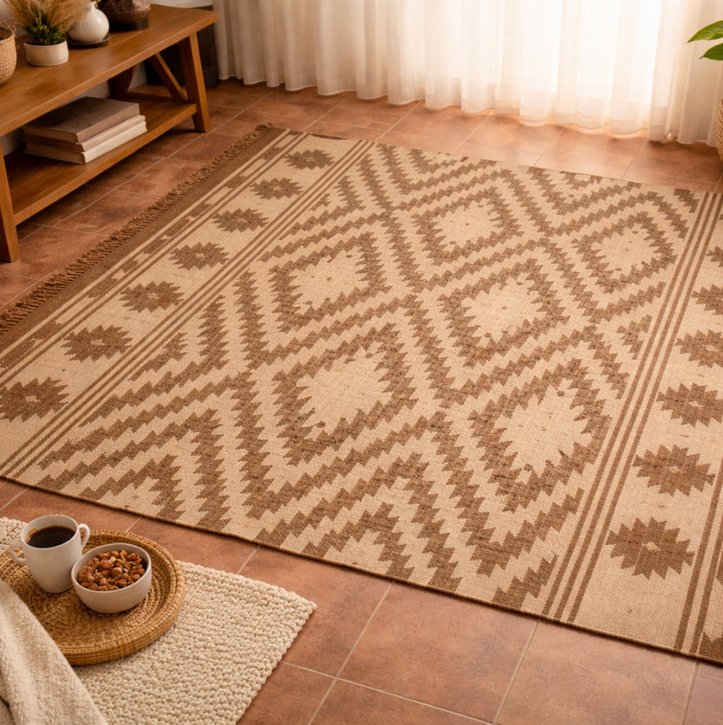 A patterned jute rug with subtle geometric detailing, adding character and depth to contemporary homes.