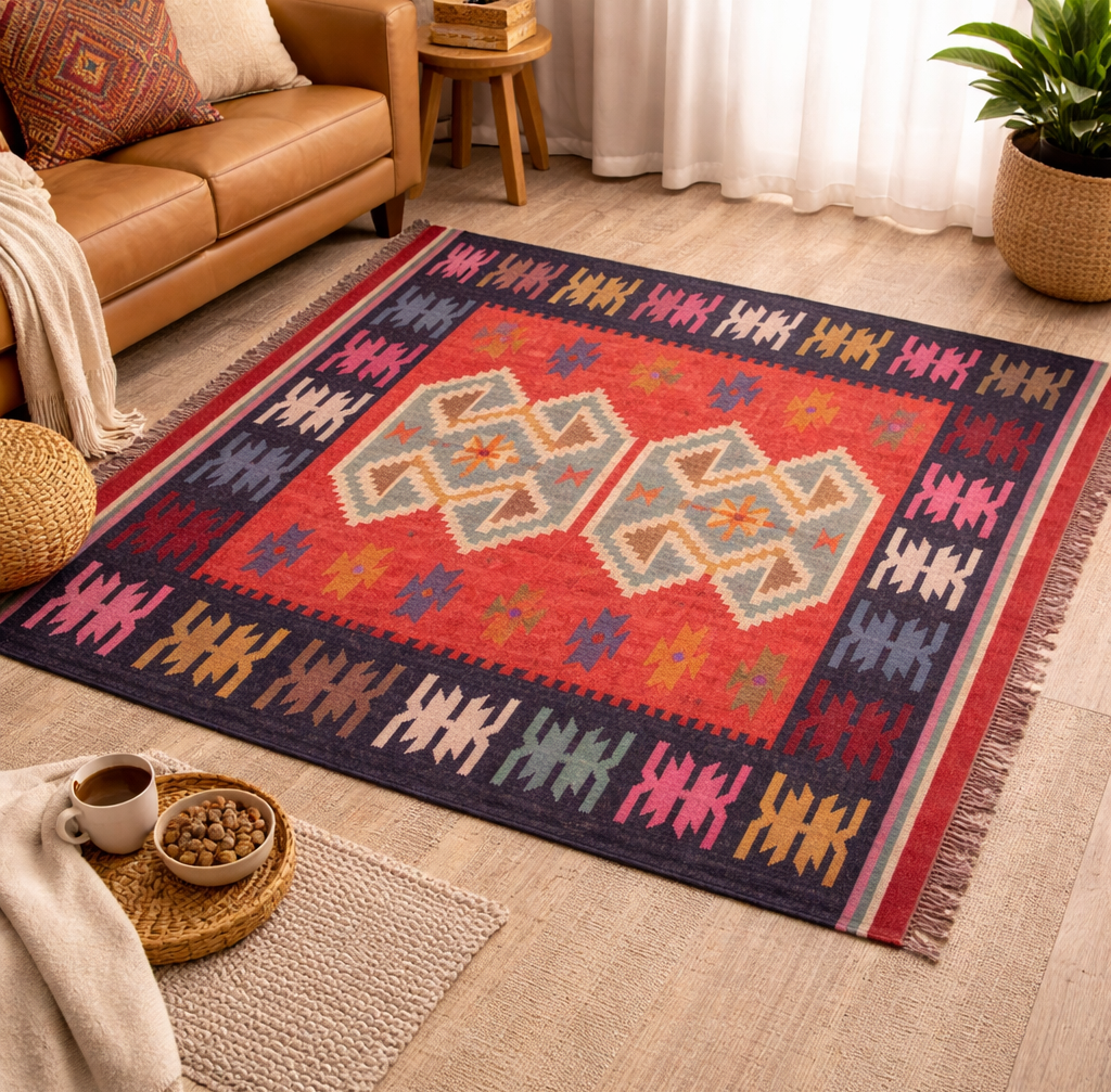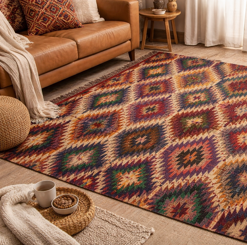 Colorful boho area rug with vibrant patterns, ideal for modern living rooms, cozy spaces, and artistic home décor.