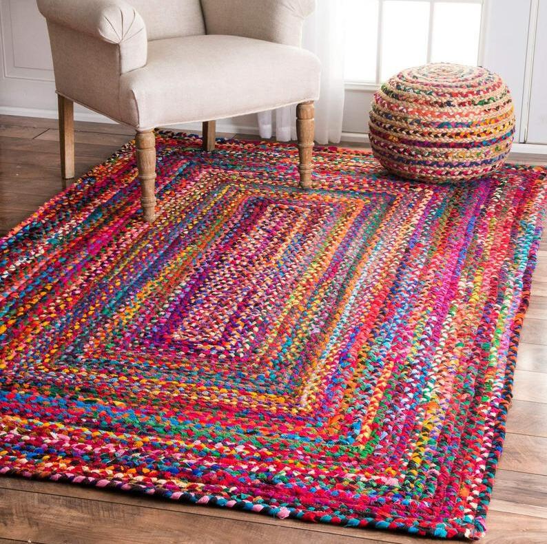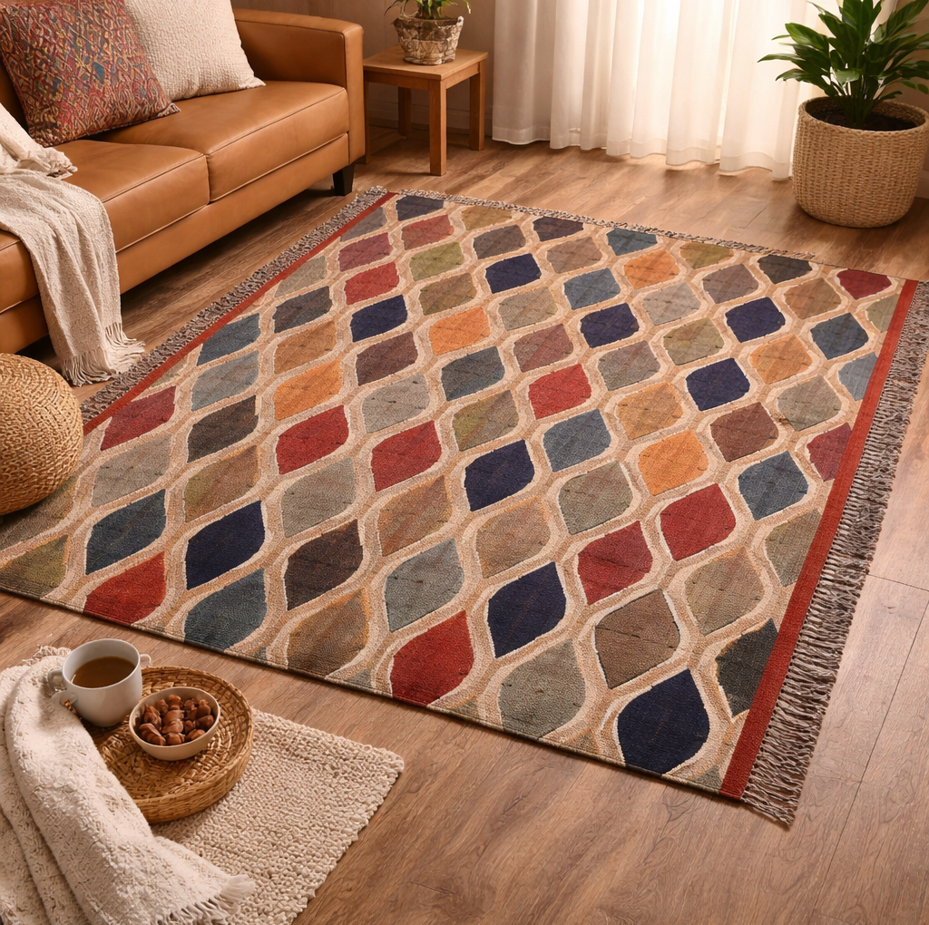 Colorful patterned jute rug for boho décor, perfect for living room and bedroom, eco-friendly handcrafted natural fiber rug.