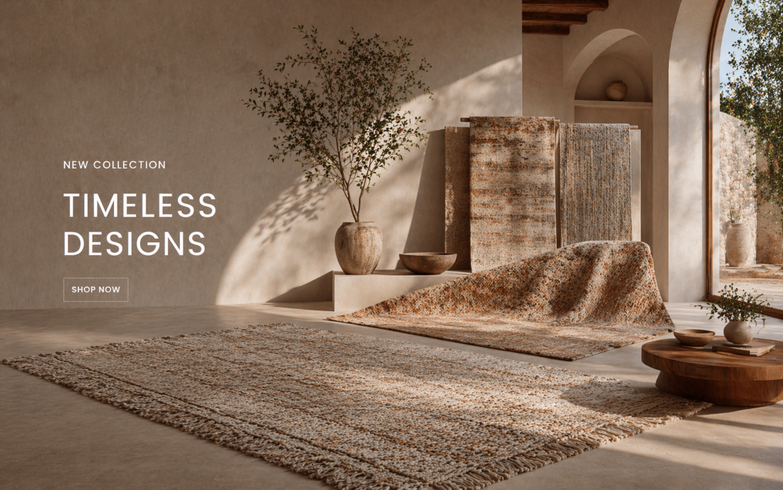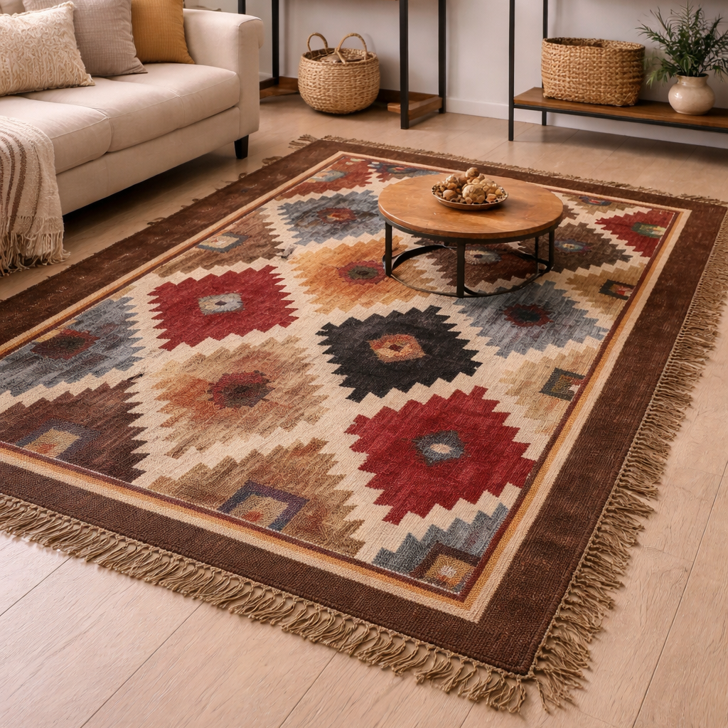 A classic woven jute rug with rich natural tones, ideal for creating a cozy and earthy ambiance.
