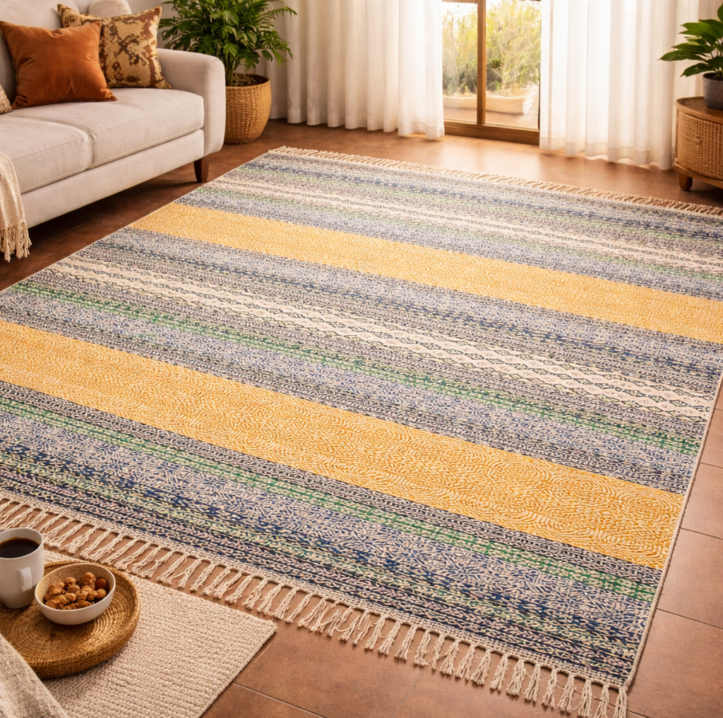 Textured striped rug with vibrant tones, great for lively modern interiors.