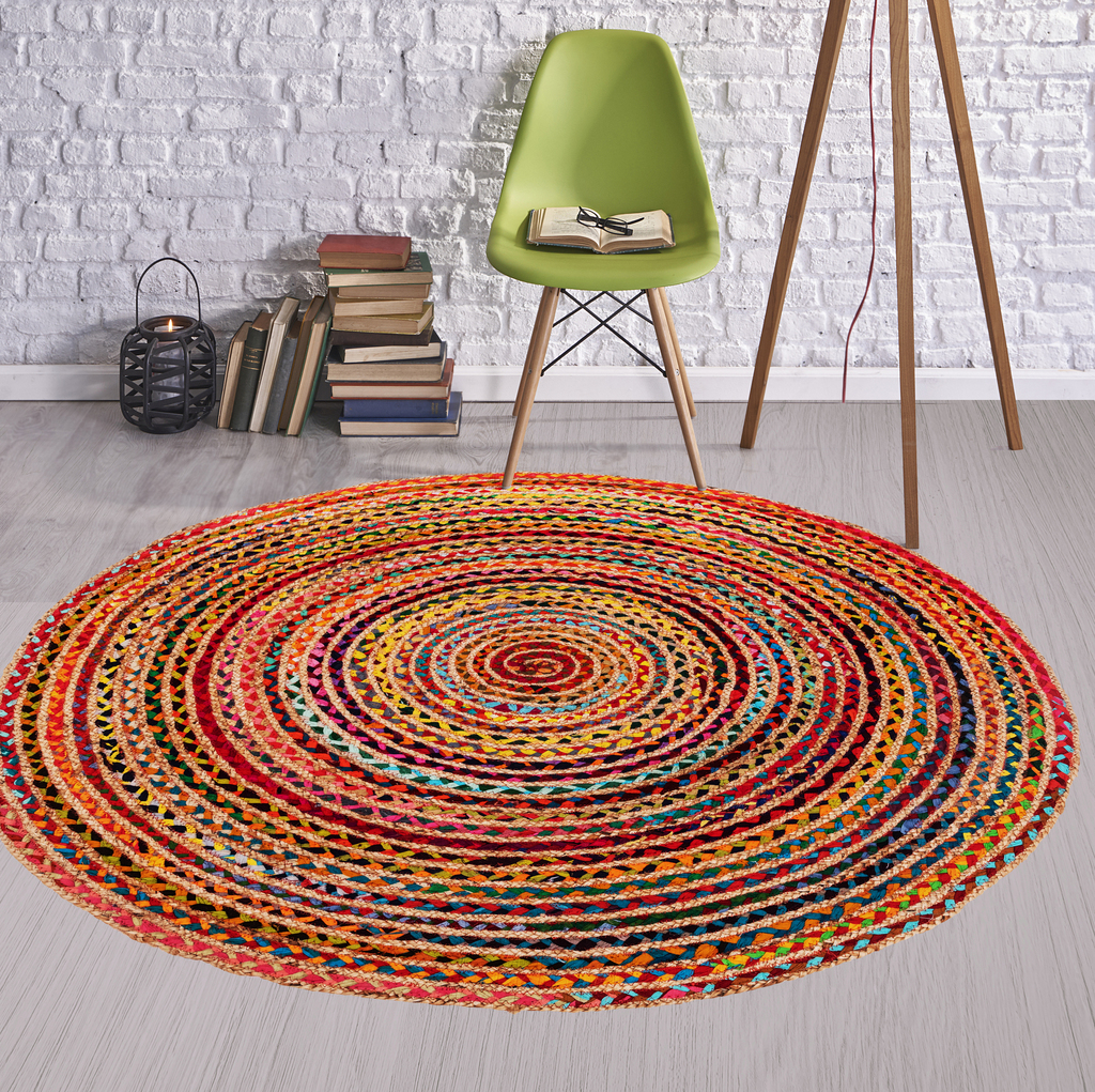 Round vibrant chindi rug, ideal for adding a bold accent.