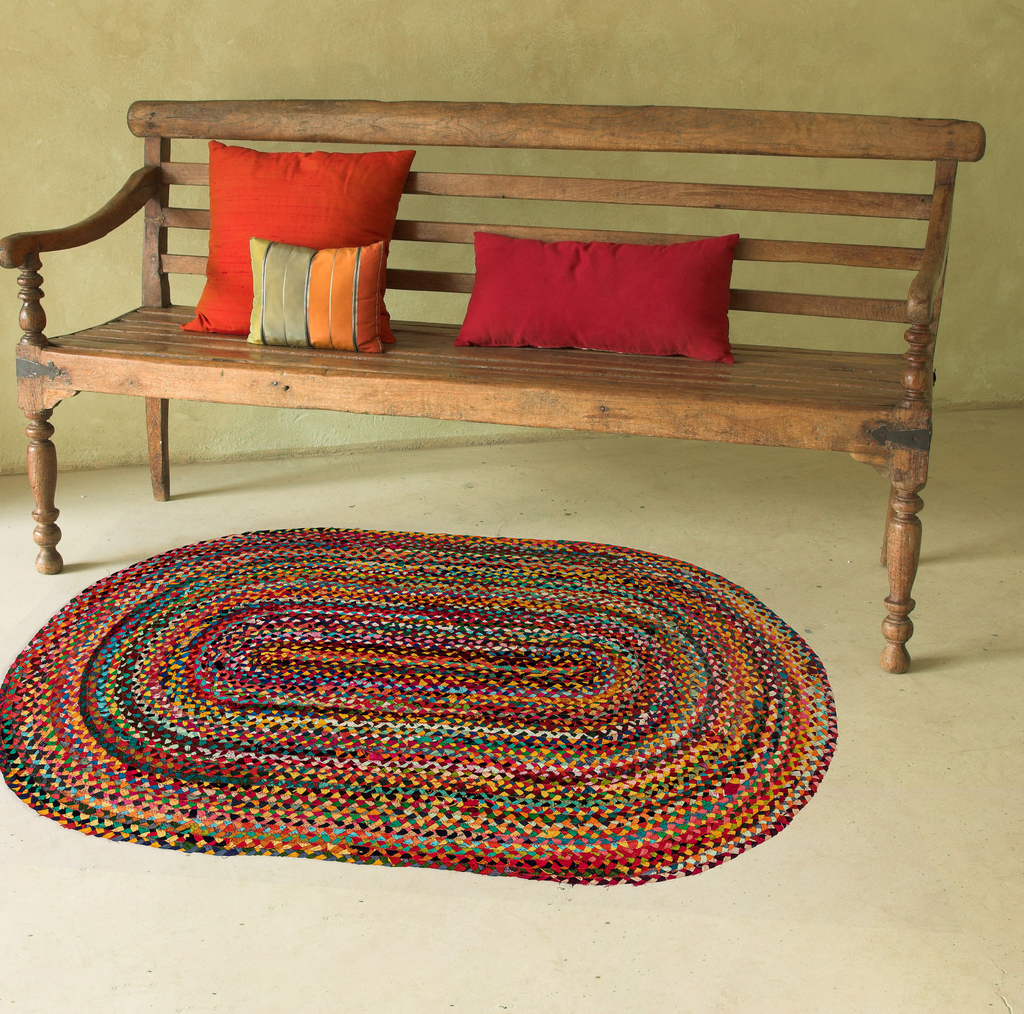 Multicolor oval chindi rug with a cozy, handcrafted look.
