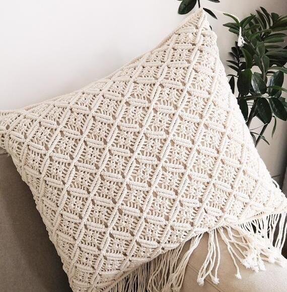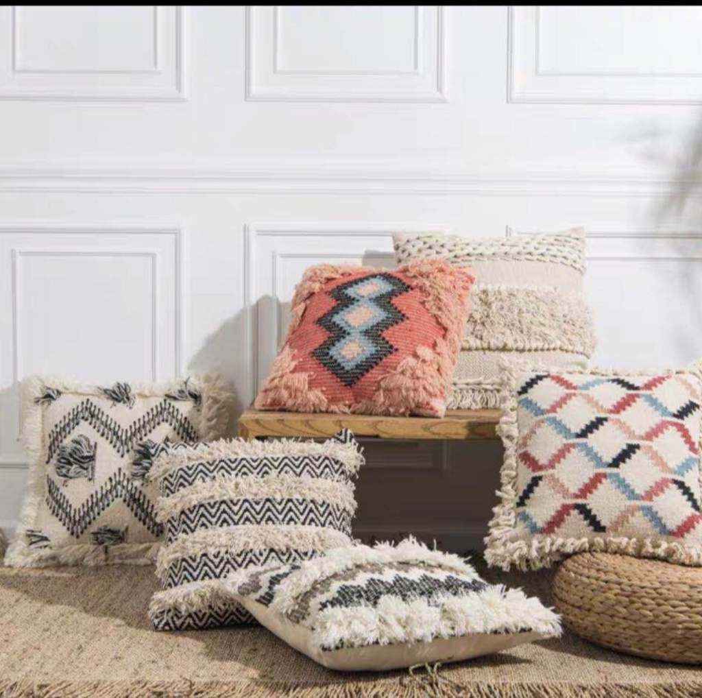 Handwoven cushion with tassels, perfect for a soft, boho feel.