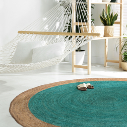 A refreshing round jute rug with a vibrant teal center, perfect for adding a pop of color to minimal and modern interiors.