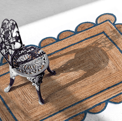 A uniquely designed jute rug with a decorative border, blending traditional charm with contemporary elegance.