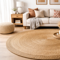 A classic natural jute rug featuring a timeless round weave, ideal for warm, earthy, and Scandinavian-style spaces.
