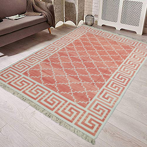 Peach geometric border rug for living room and bedroom, ideal for modern décor, soft color palettes, and elegant interiors.
