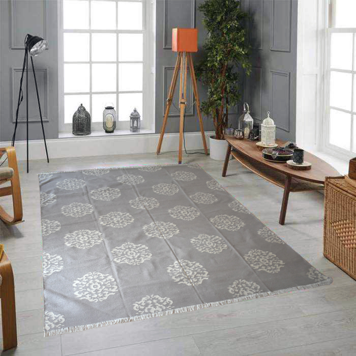 Neutral grey patterned rug for contemporary interiors, perfect for living room, bedroom, and minimalist home styling.