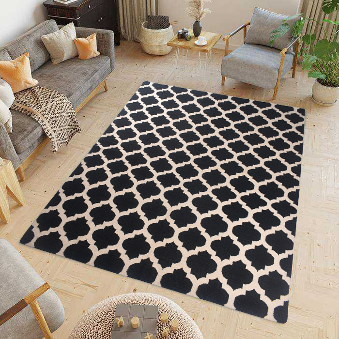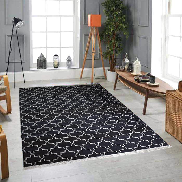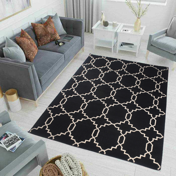 Black geometric rug for modern living rooms, perfect for bold and stylish interiors.